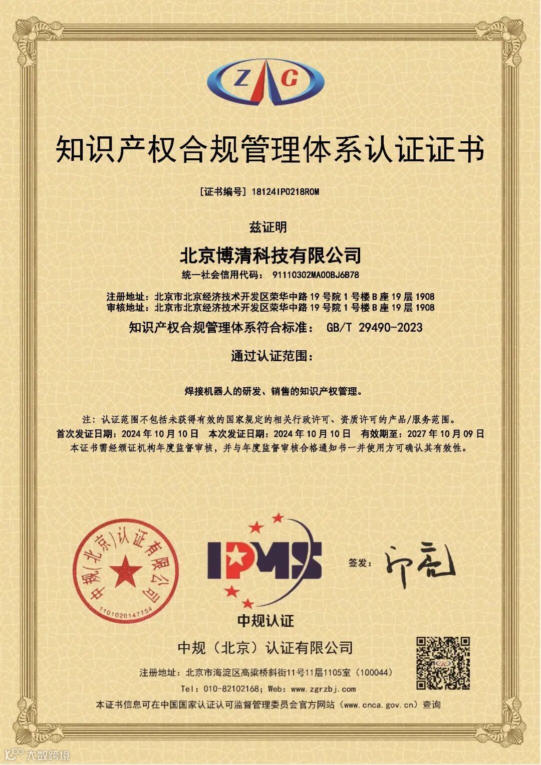 博清科技通过知识产权合规管理体系新国标认证
