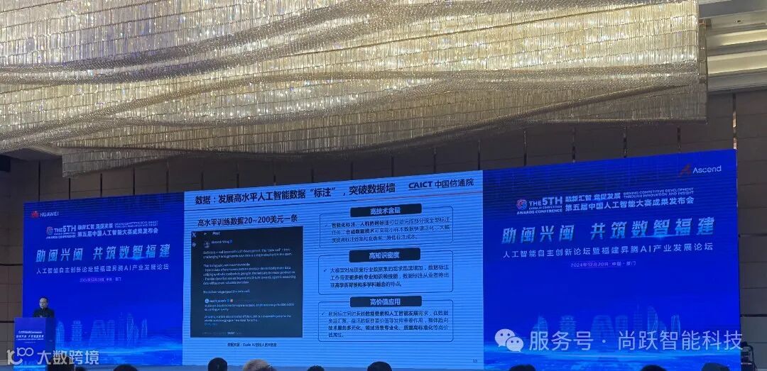2024年12月20日,由厦门市人民政府主办的中国人工智能大赛成果发布会在厦门成功举办。厦门市委常委、副市长庄荣良,国家互联网信息办公室以及公安部相关领导在会上致辞,工业和信息化部相关领导出席会议。中国信息通信研究院、中国移动、深信服、腾讯、启明星辰、厦门微亚等单位代表进行了主题演讲。来自政府部门、人工智能企业、科研院所代表400余人参加会议。尚跃智能科技作为嘉宾出席会议。