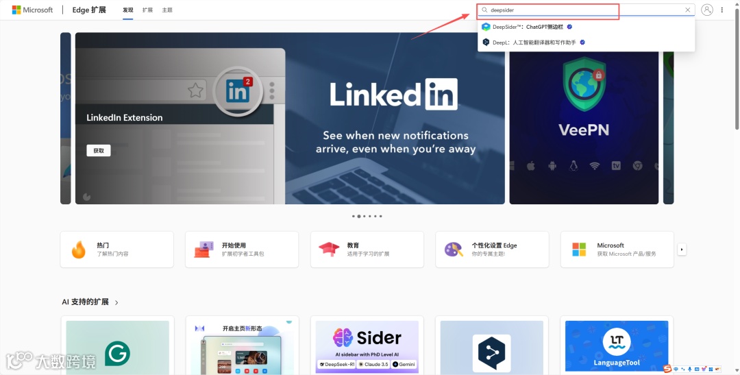 2、在跳转出的扩展商店搜索deepsider,点击【
