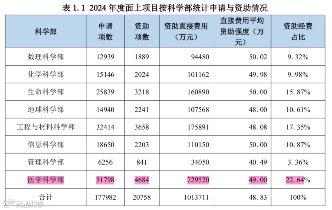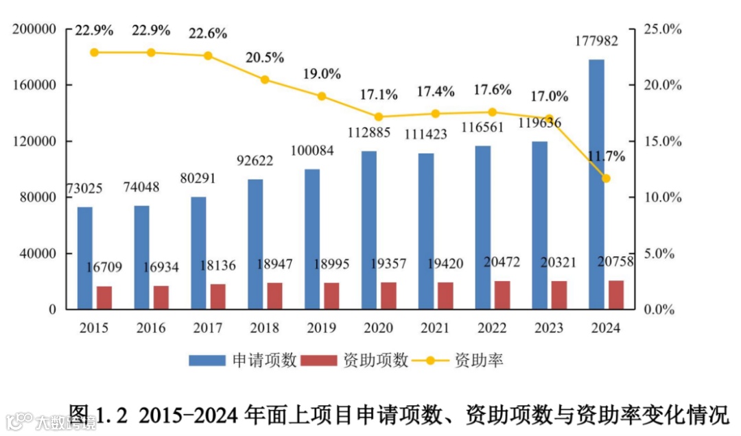 随着“申二停一”限制取消,2024年基金申请卷出了新高度,面上项目平均资助率跌至11.7%,医学科学部是最卷的赛道,申请项数最多,资助率低至9%。