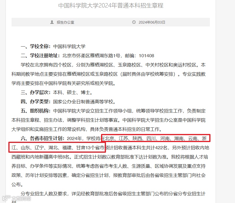 2024年国科大仅面向北京、江苏、陕西、四川、河南、湖南、云南、浙江、山东、辽宁、湖北、福建、甘肃13个省市招生。