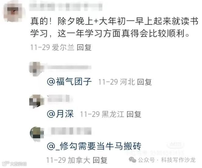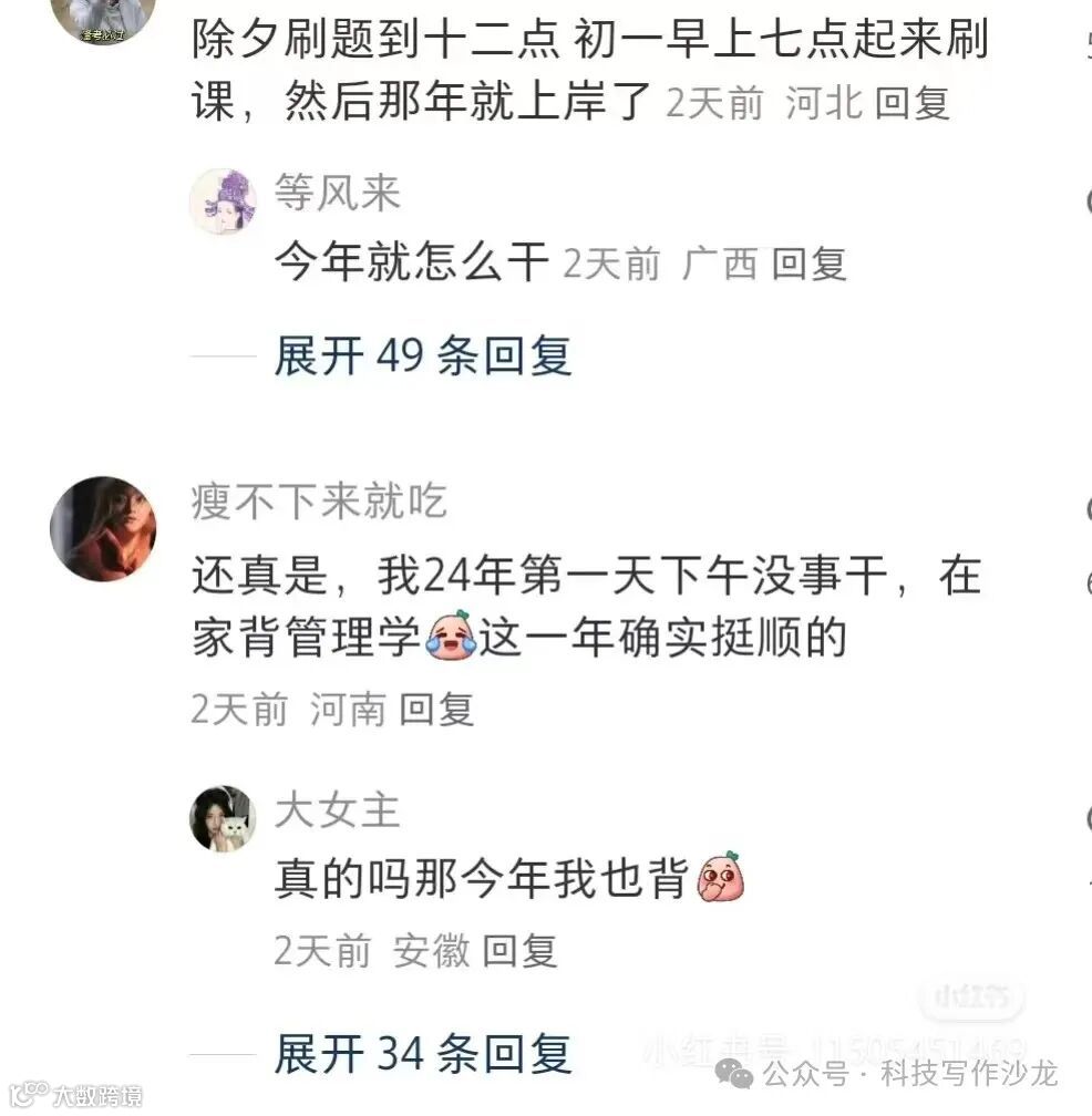 最近小青椒在刷小红书时,看到一些很有意思的帖子。在如此内卷的环境下,不少年轻人也开始走上了相信玄学之路,下文中给大家分享了一些比较有意思的评论。结论无非就是一点,大年初一的所作所为决定了一年的运势。在大年初一还在努力学习的,这一年都会取得理想的成绩!其实小青椒认为,如果能在过年的氛围下,依然保持初心,静心学习,那说明你的学习状态在任何情况下都能保持高效率,这才是最终取得理想成绩的根本原因!