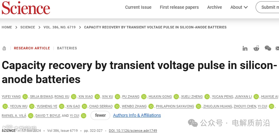 Capacity recovery by transient voltage pulse in silicon-anode batteries. Science (2024). DOI:10.1126/science.adn1749