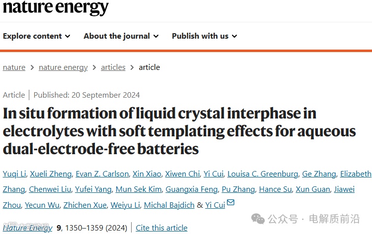 In situ formation of liquid crystal interphase in electrolytes with soft templating effects for aqueous dual-electrode-free batteries.