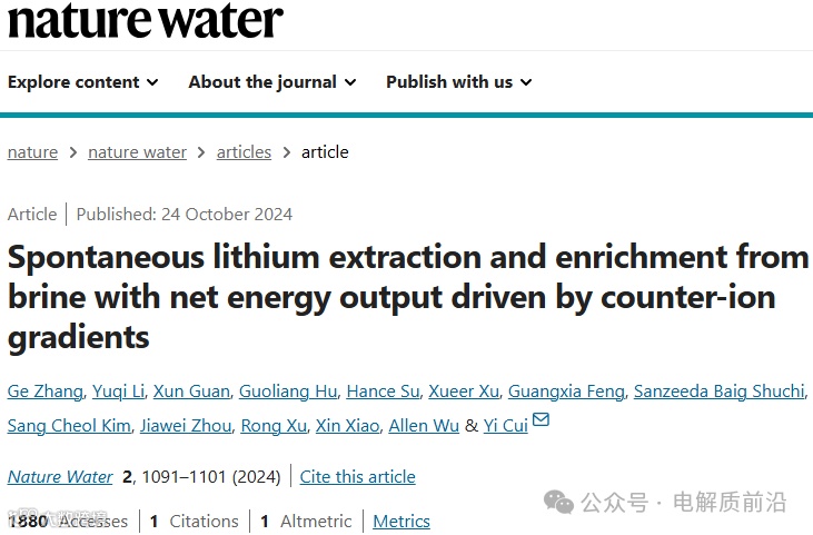 9.不需要外在能量,反而产生电能进行卤水锂元素提纯,巧妙利用了阴离子浓度差提供免费的能量,由博士后Ge Zhang领衔, 论文在Nature Water上发表;