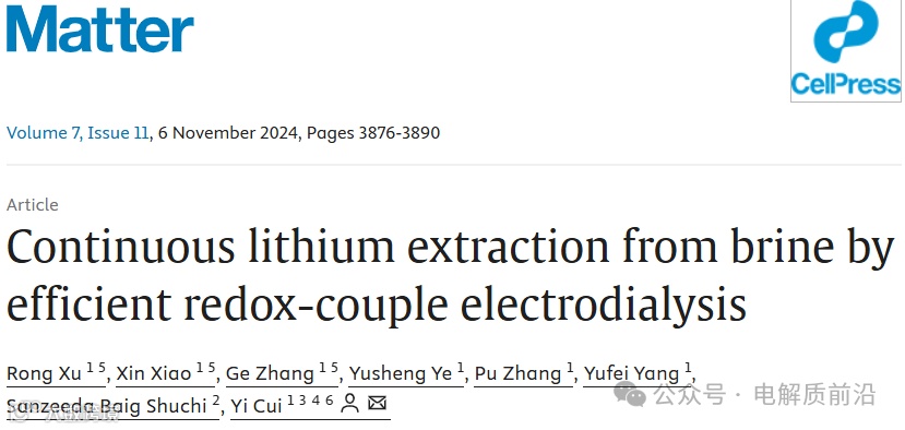 Continuous lithium extraction from brine by efficient redox-couple electrodialysis,Matter, 2024, https://doi.org/10.1016/j.matt.2024.07.014.