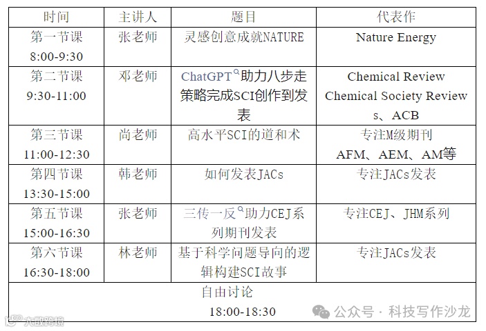 特邀6位发表过多篇高分SCI论文如Nature, Science子刊,JACS, Angew Chemie International Edition,EES,AEM,AFM,ACB,CEJ等的一线教师,分享多年写作经验和投稿经验。具体讲解内容:研究型、快报型和综述型论文的构思、实验设计、结构设计、逻辑表达、故事情节构建、英语语言描述、审稿回复、争辩技巧和证据辅助等方面的内容。如引言,实验部分,cover letter,补充材料,摘要,结论,结构与讨论的具体描写。 辅导班口号,心中有科学,眼中无学科,高分论文不分专业。