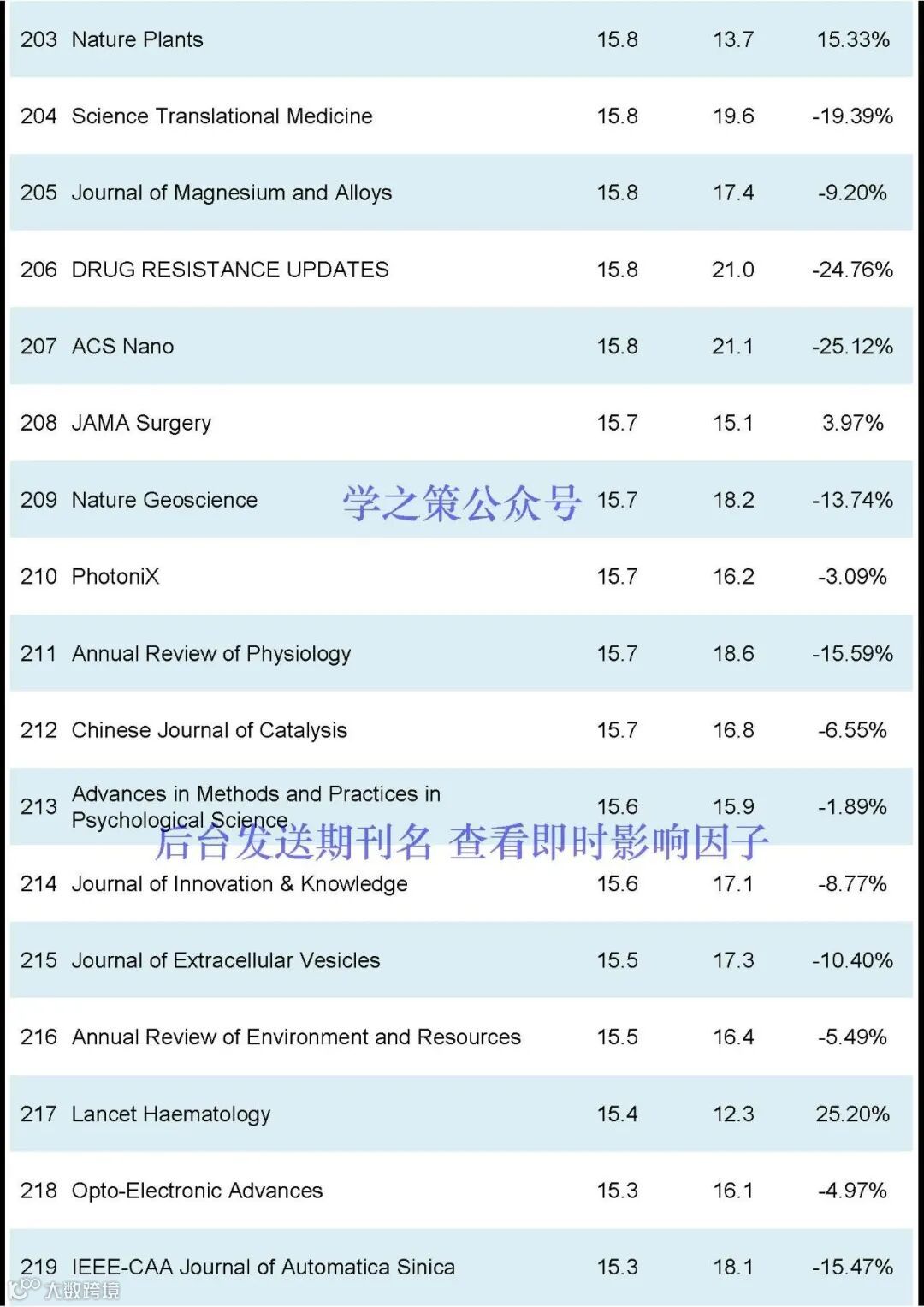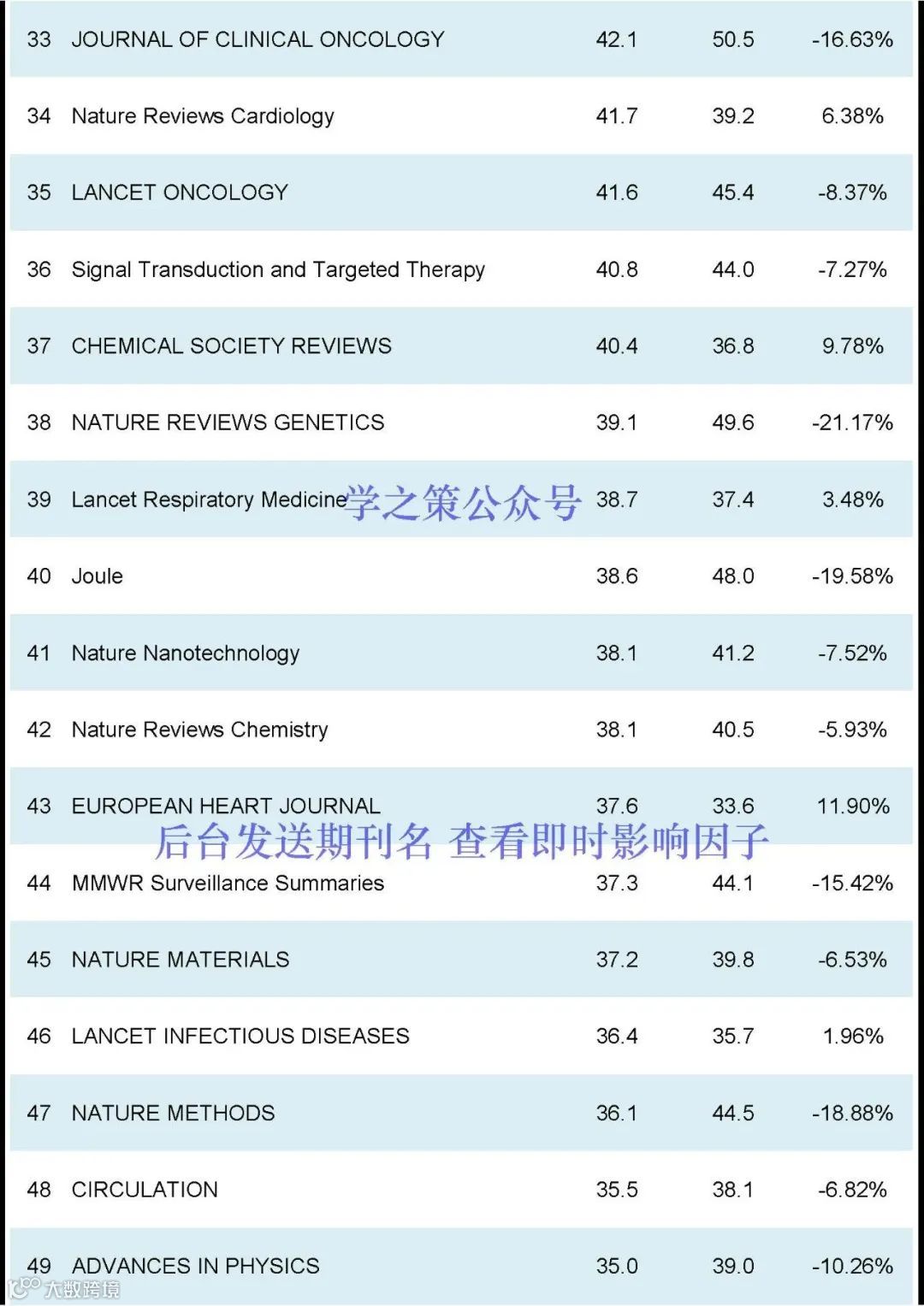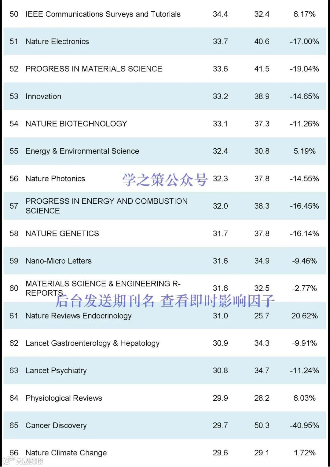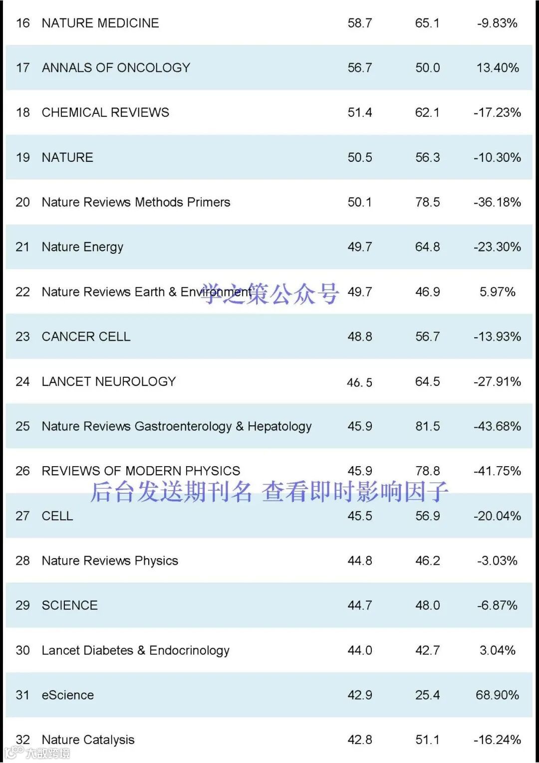 Nature和Science均有下降,Nature, IF:50.5(去年: 64.8);Science, IF: 44.7 (去年: 56.9);Cell, IF:64.5(去年:45.5)。
