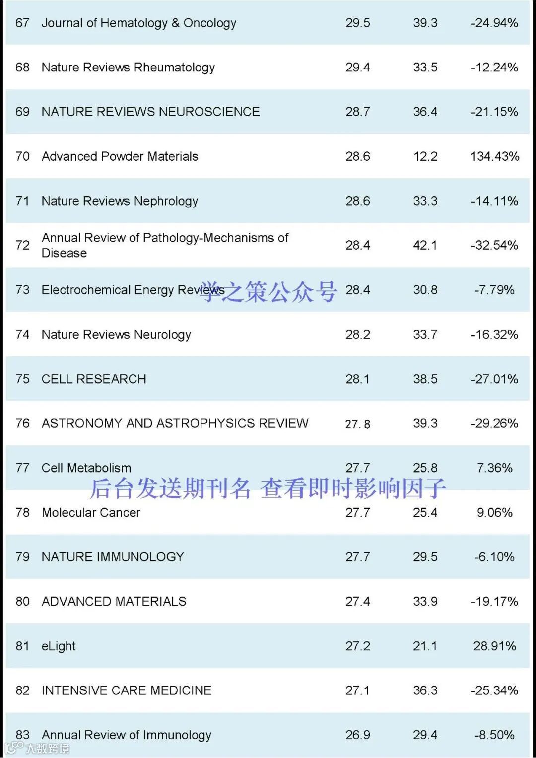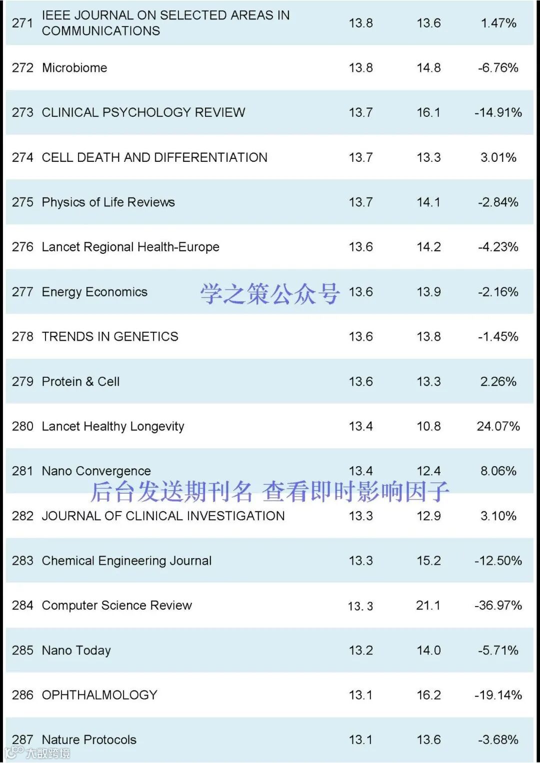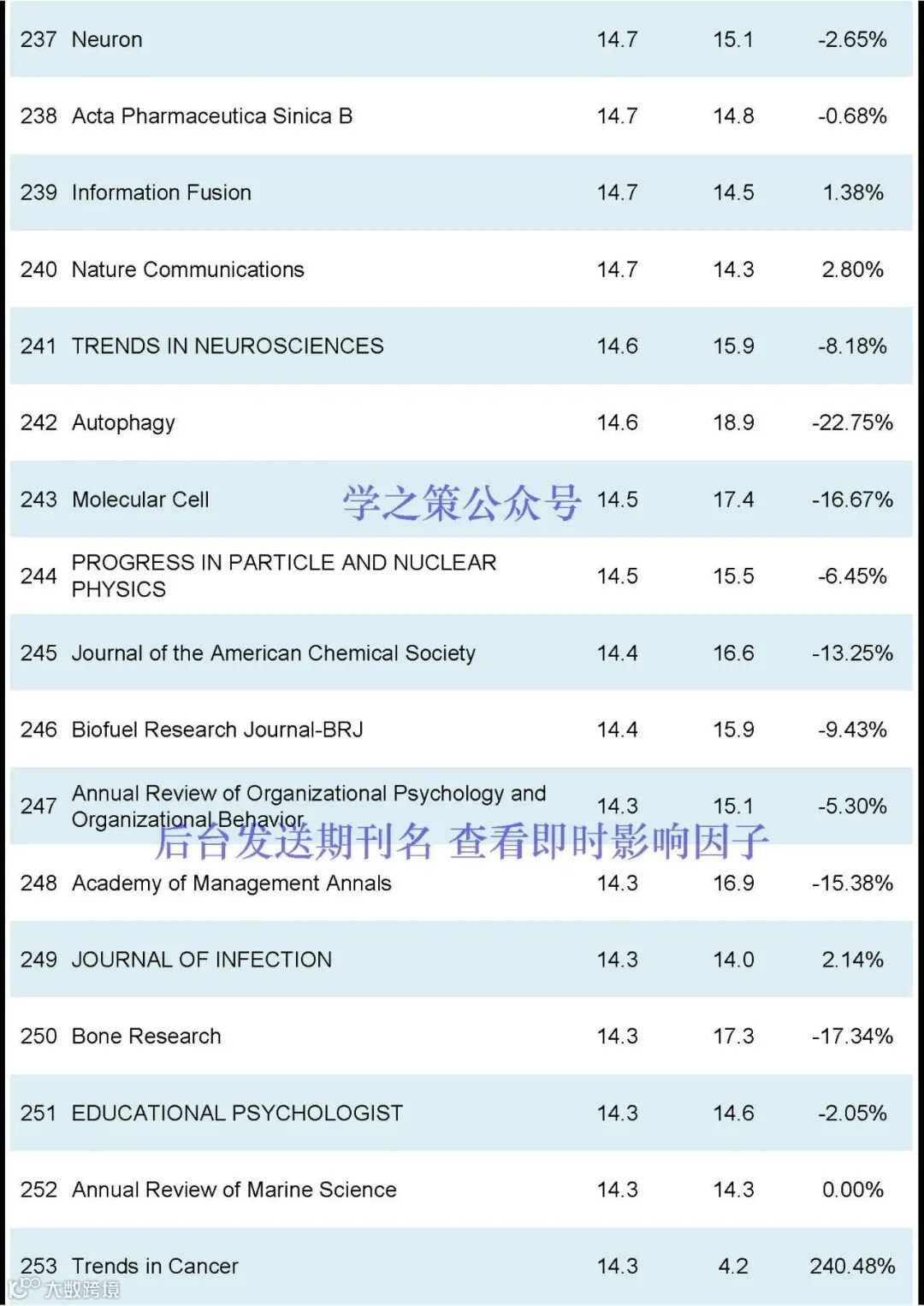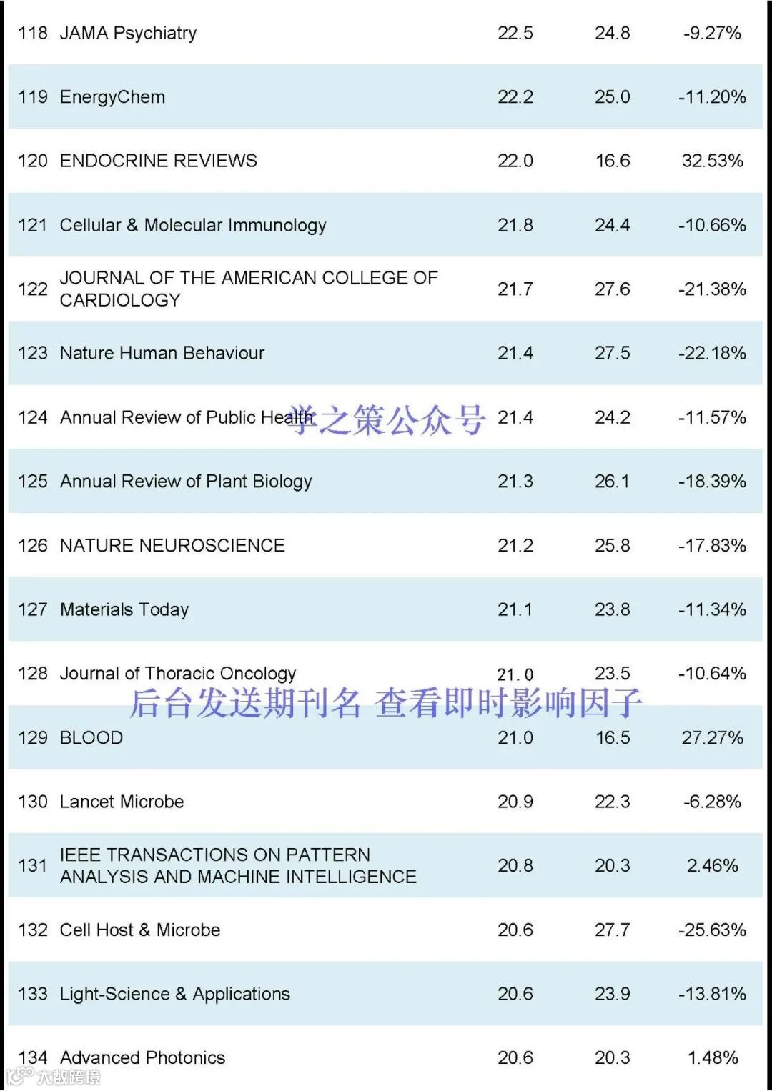 Nature和Science均有下降,Nature, IF:50.5(去年: 64.8);Science, IF: 44.7 (去年: 56.9);Cell, IF:64.5(去年:45.5)。