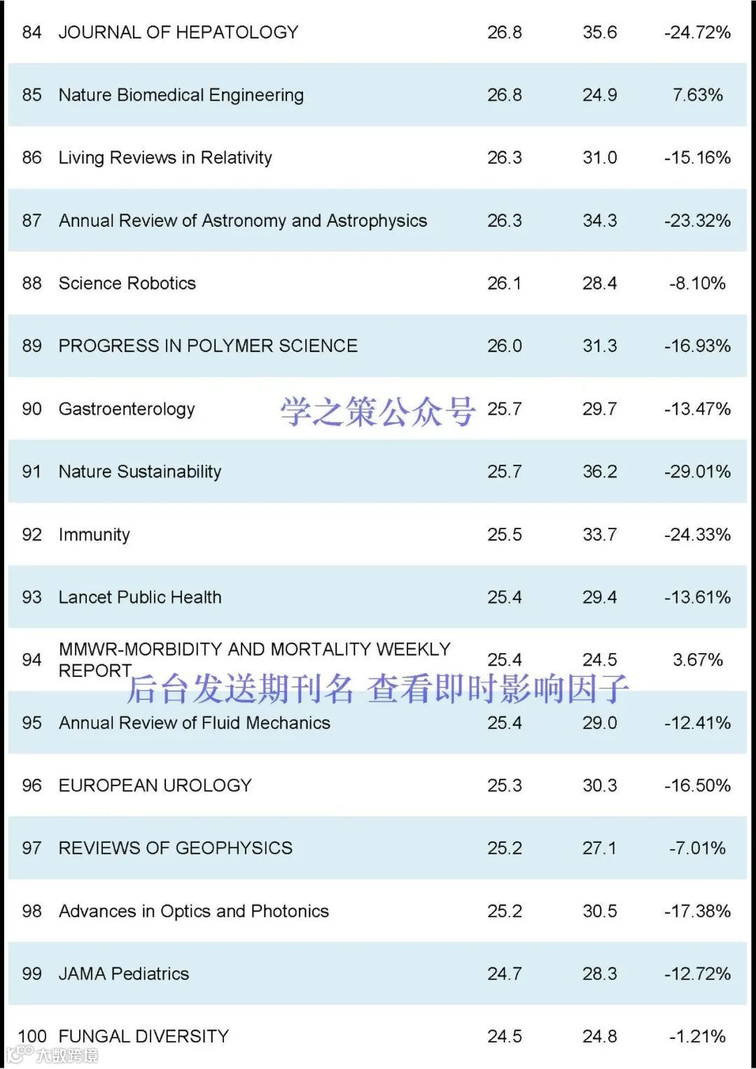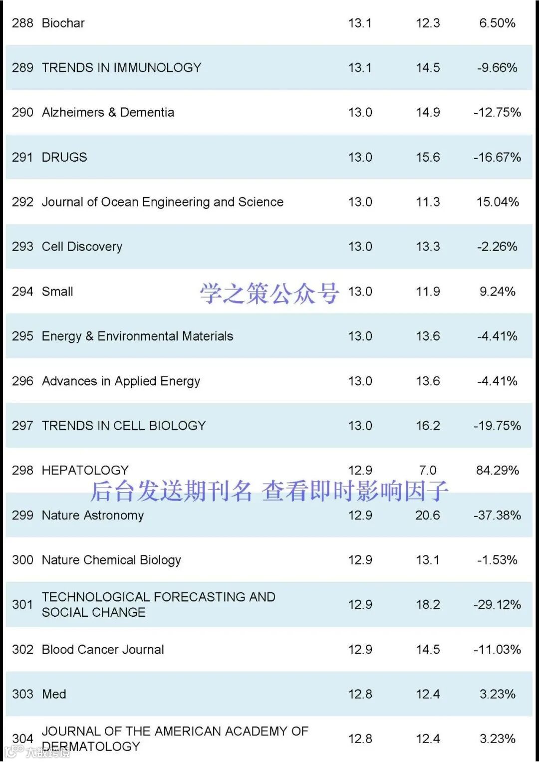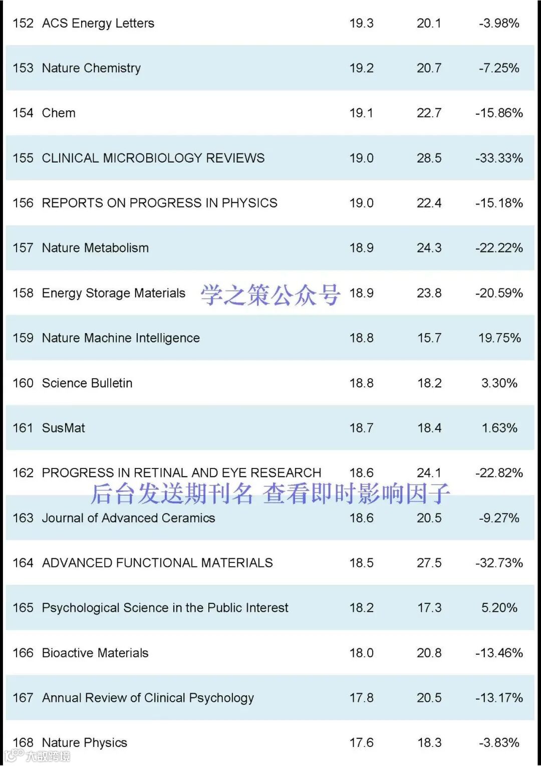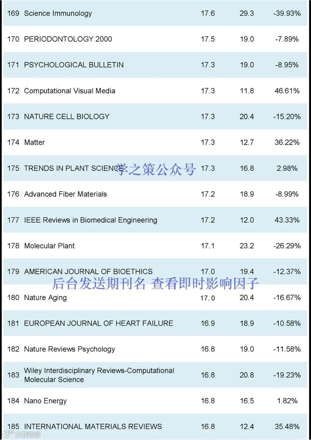 Nature和Science均有下降,Nature, IF:50.5(去年: 64.8);Science, IF: 44.7 (去年: 56.9);Cell, IF:64.5(去年:45.5)。