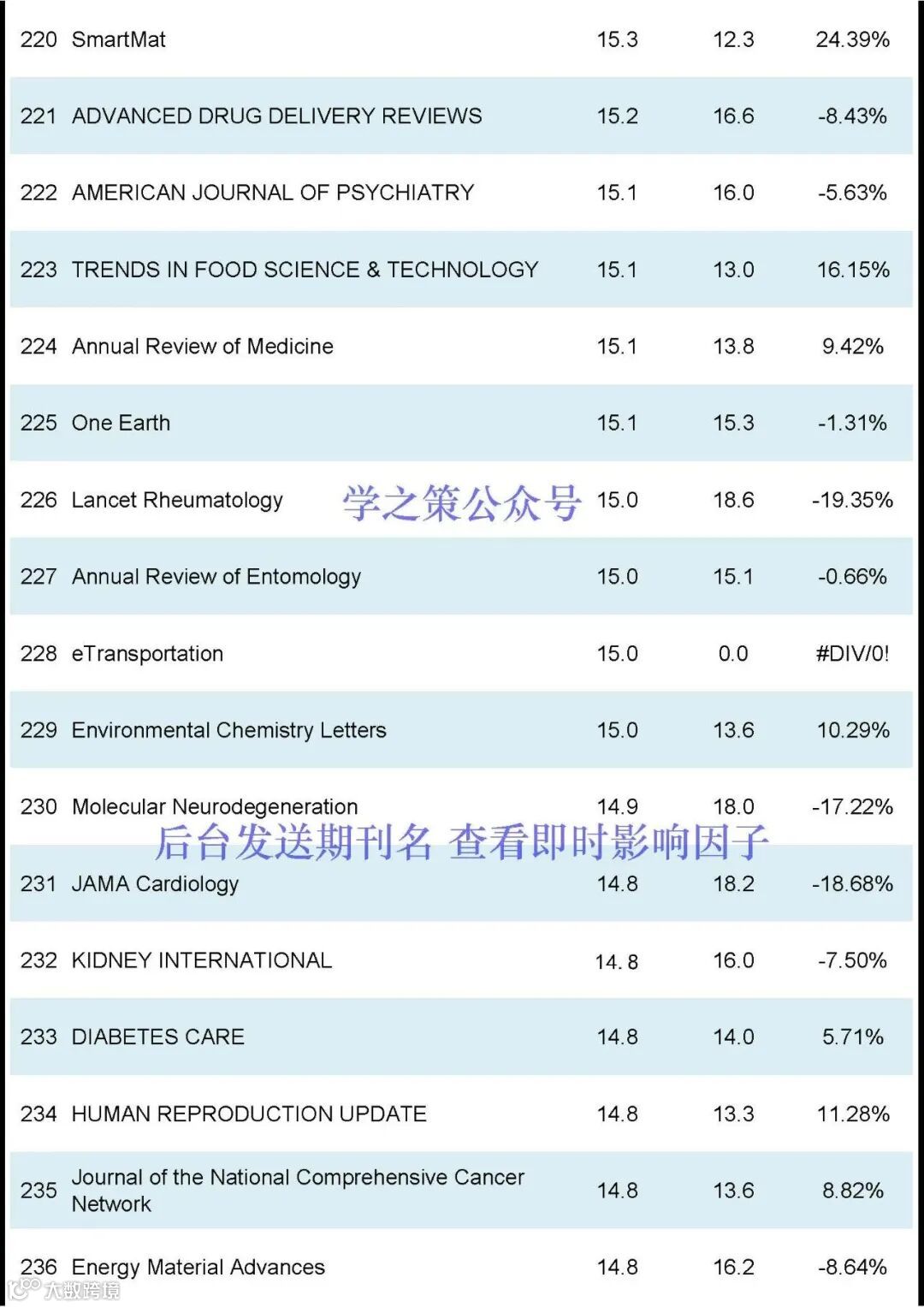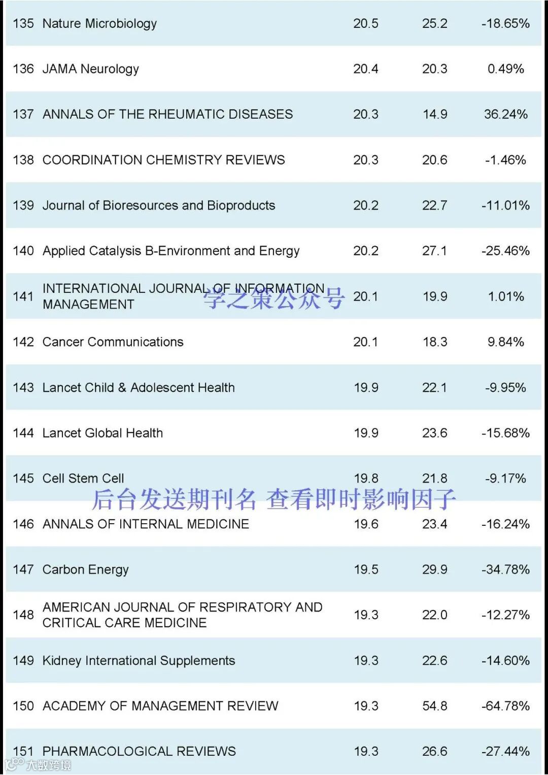 影响因子最高的仍然是Ca-A Cancer Journal for Clinicians,去年为254.7,今年重回巅峰至503.1。