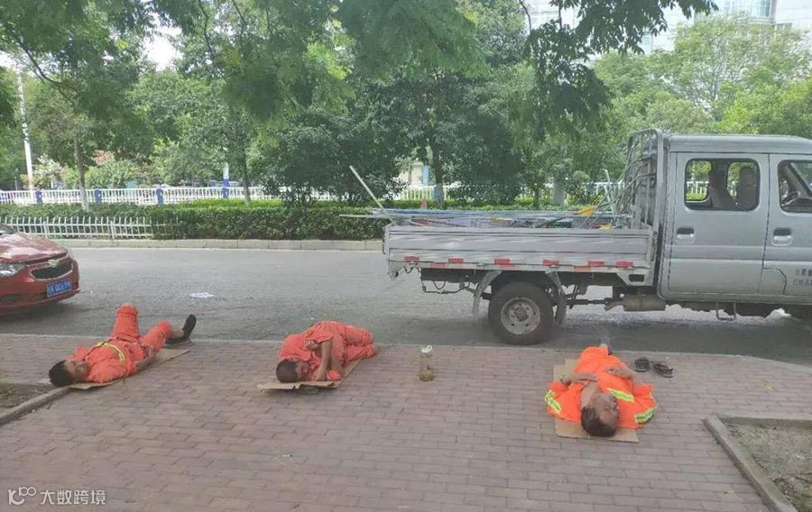 7月18日在阜阳一道河路上,顶着酷暑工作完的三位环卫工人正趟在路边休息。在这炎热的夏季,他们清扫着路面、清理着垃圾、维护着城市的环境卫生,你永远不知道的是汗水每天把他们的衣衫浸透了多少次。所以,请不要再随地乱扔垃圾,你多一份爱心,也许他们就能早一分回家休息。