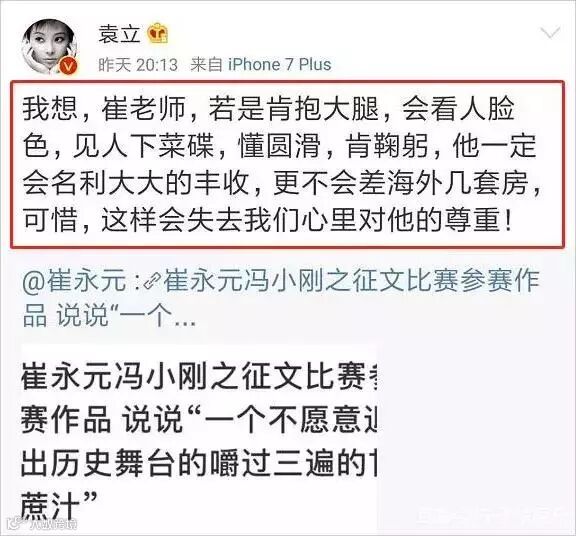 袁立在评论中写道:“我想,崔老师若是肯抱大腿,会看人脸色、见人下菜碟,懂圆滑、肯鞠躬,他一定会名利大大的丰收,更不会差海外几套房。可惜,这样会失去我们心里对他的尊重。”