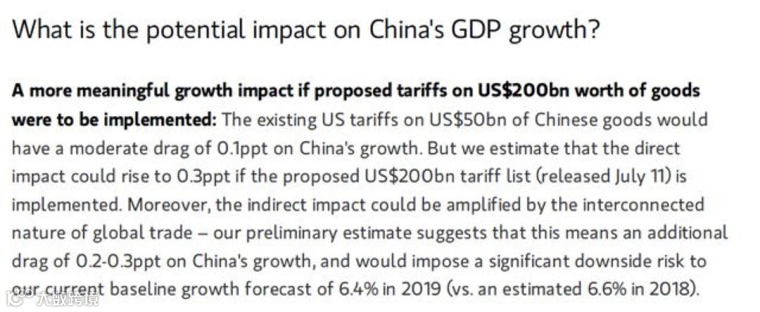 美国著名投资银行摩根斯坦利,近日就发布了一份报告。其核心结论有三条:美国对中国340亿美元商品加征关税,会令中国GDP增速下降0.1个百分点;如果继续对2000亿美元商品加征关税,会下降0.3个百分点;这些动作的间接影响传导下来,会再给中国GDP增加0.2到0.3个百分点的下行影响。