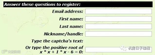 先看一下注册的地方,这几个是必须要填的,第一行填邮箱(建议是sina邮箱),后面写名字和昵称(并不重要,因为之后它会发给你),填入验证码,计算这个方程的正根。