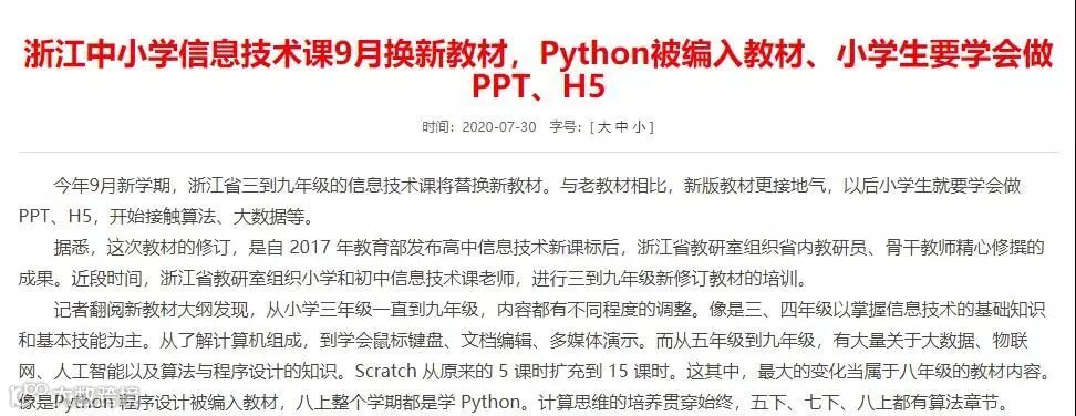 浙江省发布消息,秋季新学期三到九年级信息技术课将同步替换新教材。八年级新增 Python 内容,大数据、人工智能、程序设计与算法按照教材规划五六年级开始接触。