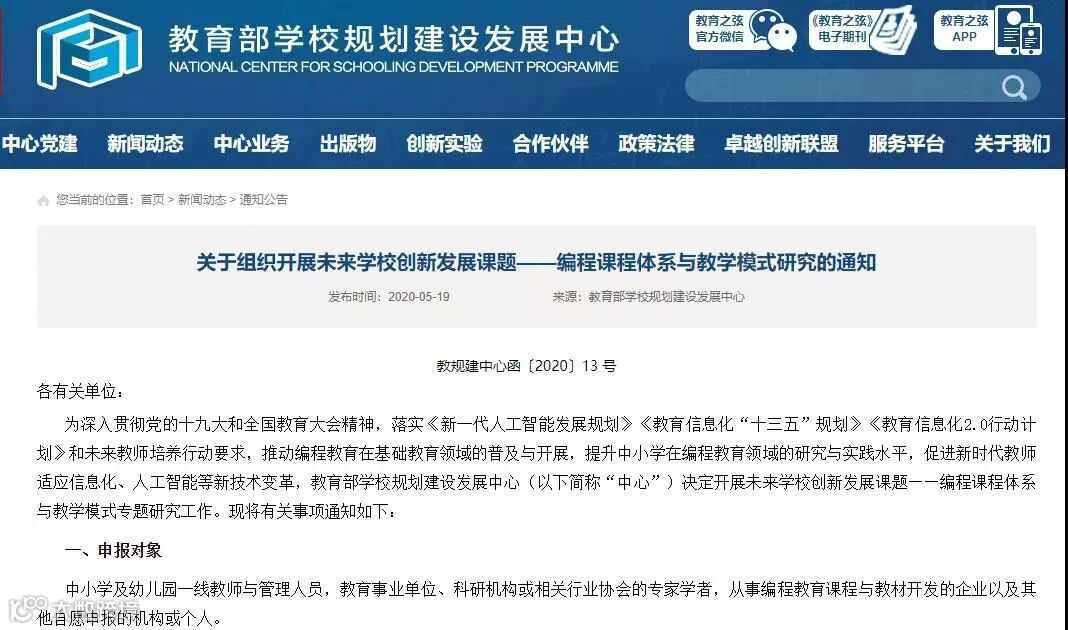 教育部学校规划建设发展中心决定开展未来学校创新发展课题——编程课程体系与教学模式专题研究工作。