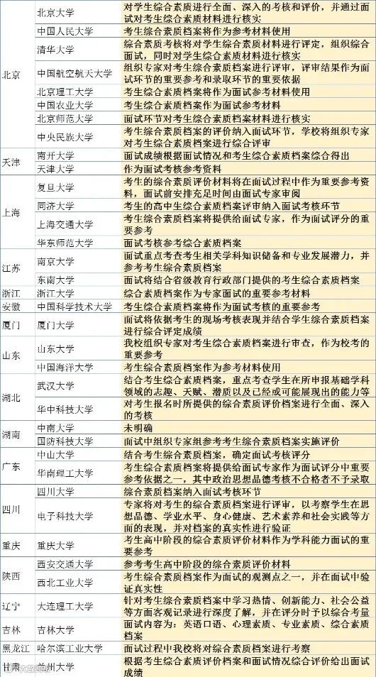 从表格可以看出,除了中南大学没有明确指出综评档案的使用方法,余下的35所院校全部明确指出综评档案在校考面试中的作用。