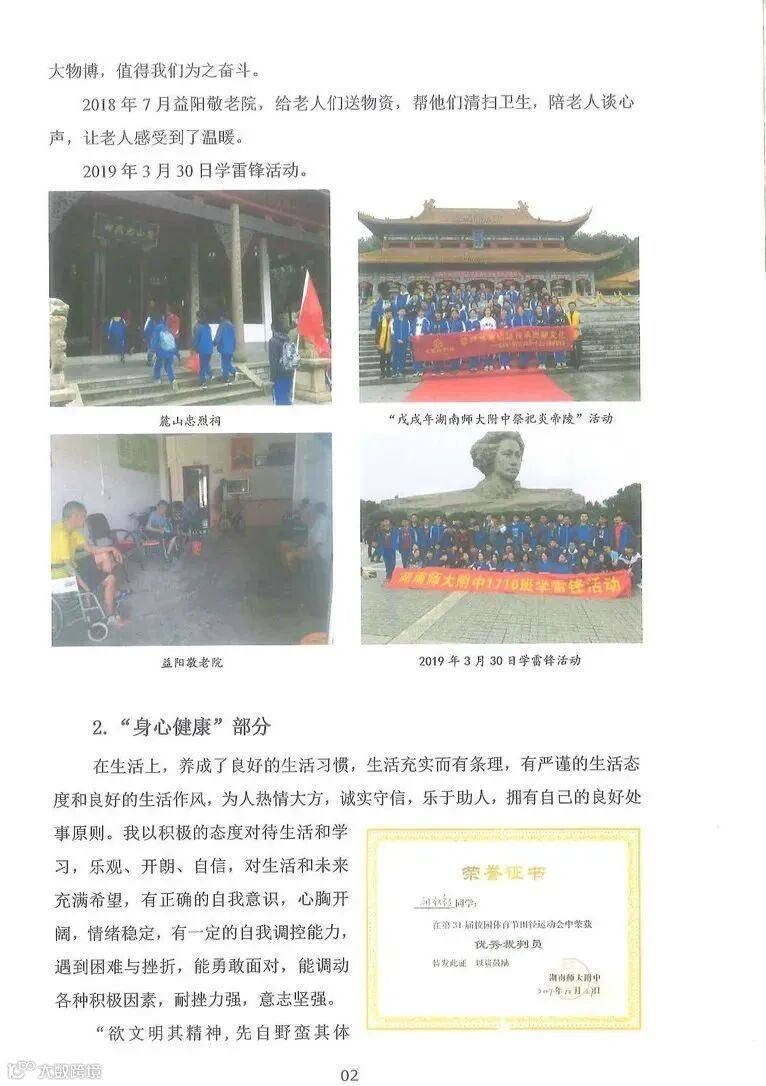 身心健康评价记录 学生的体育成绩,体育运动特长项目、参加体育活动等,比如学生特别喜欢打篮球,在学校,省市组织的篮球比赛中能积极参与甚至获奖。或者应对困难和挫折的表现等。
