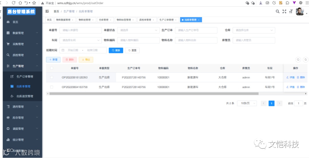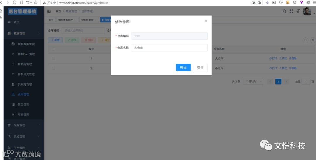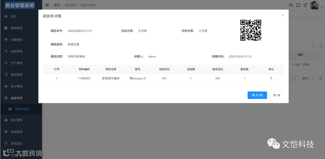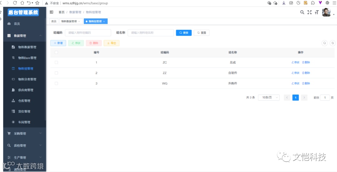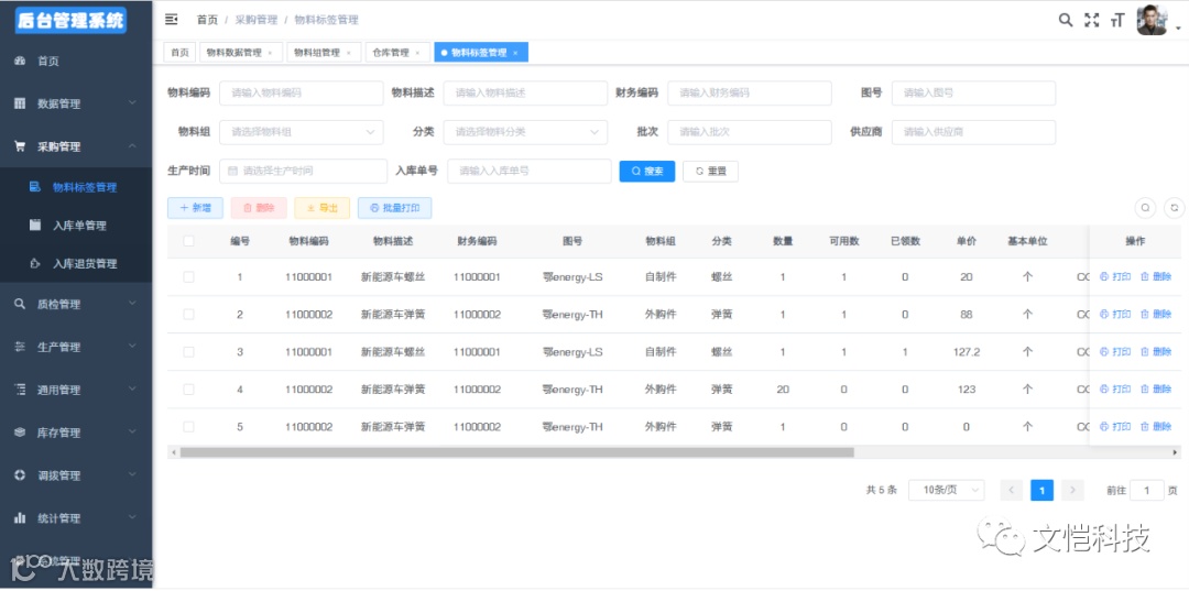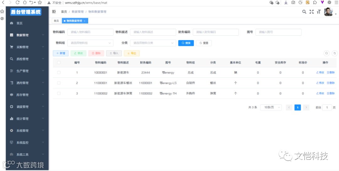 物料数据管理、物料Bom管理、物料组管理、物料分类管理、供应商管理、仓库管理、货位管理、车间管理 2、 采购管理:物料标签管理、入库单管理、入库退货管理 3、 质检管理:质检单管理(包括单据号、单据类型、创建时间、检验状态、检验员) 4、 生产管理:生产订单管理、出库单管理、出库退货管理 5、 通用管理:出库单管理、出库退货管理 6、 库存管理:库存信息管理、库存汇总管理 7、 调拨管理:调拨单管理(包括调拨单号、调拨原因、发起仓库、目标仓库、调拨进度等) 8、 统计管理:入库统计、出库统计、出入库汇总 9、 系统管理:用户管理、角色管理、菜单管理、部门管理、岗位管理、字典管理、参数设置、通知公告、日志管理 10、 系统监控:在线用户、定时任务、数据监控、服务监控、缓存监控、缓存列表 11、 系统工具:表单构建、代码生成、系统接口