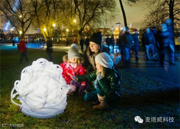 其中有趣的不止是看见建筑,河流,广场等外观有灯光做装饰,互动的光影装置艺术更让参观者能随光线玩耍,与光影共舞。