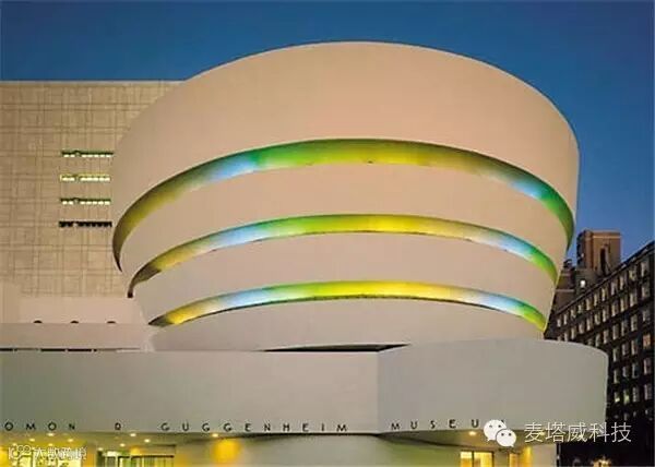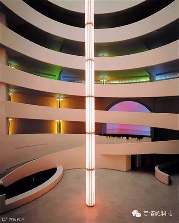 20世纪70-80年代,Flavin开始把他的灯光秀装置运用于建筑,或者说,他将他所雕塑的空间,扩大到了整个建筑及建筑外围。他的作品,变成了有特定地点的艺术品。在此阶段,最著名的作品即是古根海姆博物馆的灯光秀装置。
