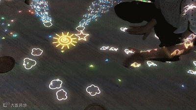 童年的跳房子回来啦!单腿踩中水面上的“ ● ▲ ■ ”脚下的色块格会有绚丽的特效,伴随着美妙的音乐。更有意思的是周围屏幕上的热带雨林也会随着脚步变幻。