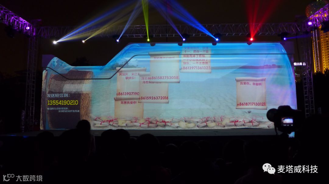 “2013武汉国际旅游节江滩裸眼3D光影秀”上,麦塔威科技设计以“漂流瓶”造型建筑为载体,以大美武汉为展示内容,以裸眼3D光影秀为展示形式,在举国欢庆之夜为相约武汉的市民和游客呈现出跃动的江城和一出出旅游美景。