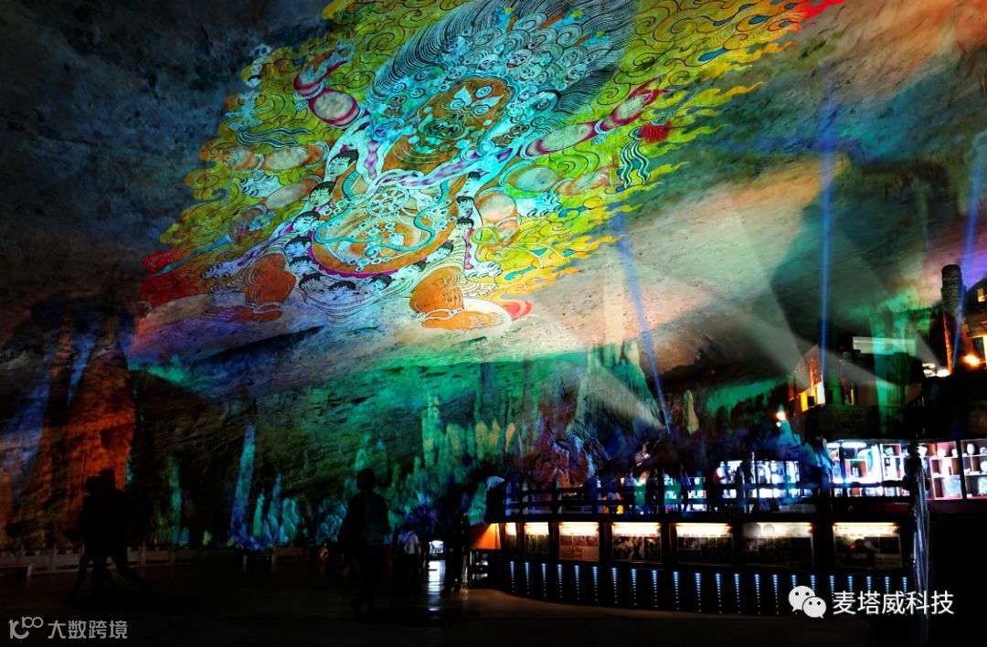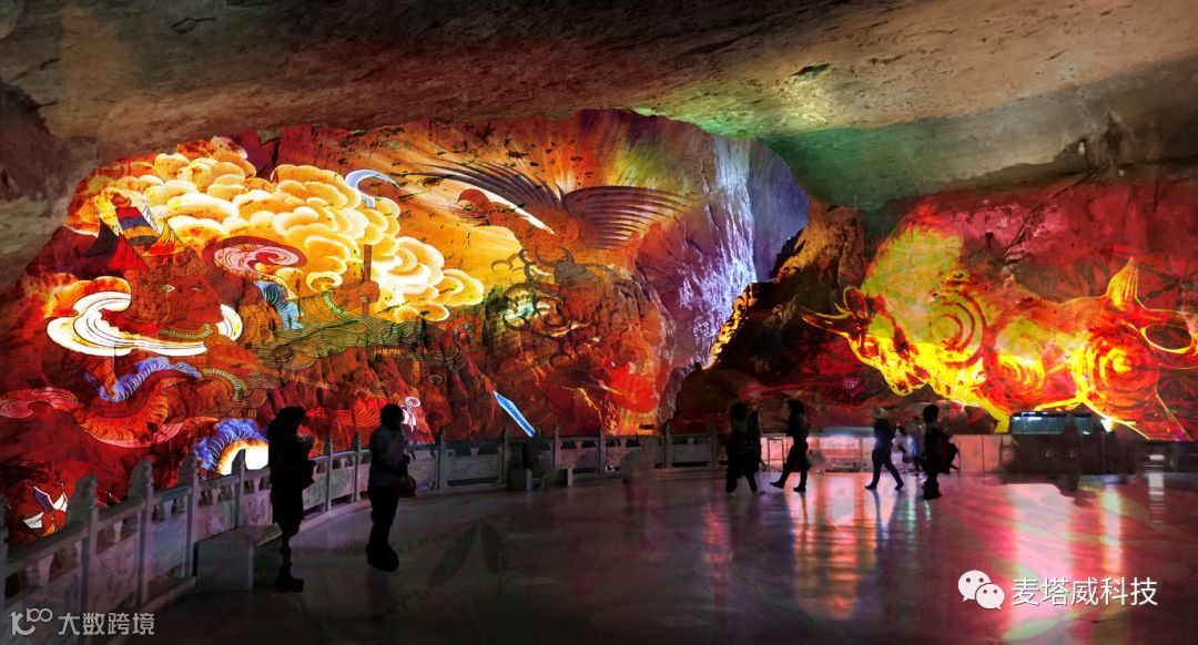 云南省九乡叠虹桥景区溶洞内灯光提升改造项目一期工程,麦塔威科技发掘彝族的传统的《百乐书》,以毕摩画为元素、以《百乐书》为内容主题,以大面积3D投影,多变主题的故事演绎为主,打造全球首个基于光影互动体验式溶洞,打造成全球最大文化艺术洞穴博物馆。