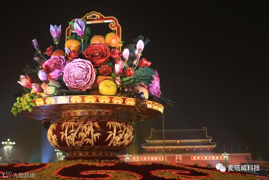 2013年国庆期间,在北京天安门广场大花篮篮体采用多媒体亮化方案,麦塔威科技设计以欢庆建国64周年为目的,祝福祖国为主题,通过立体动画影像投射,赋予了景观生命活力,塑造首都城市新形象。