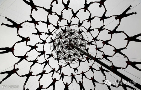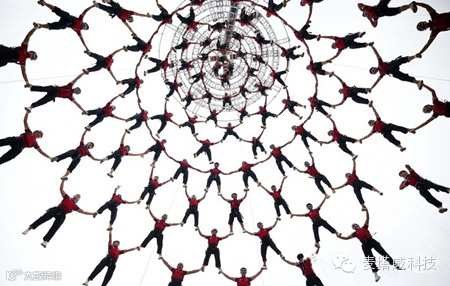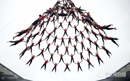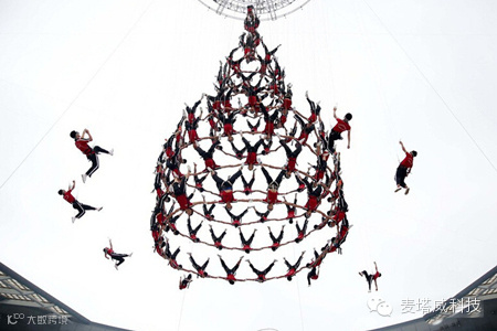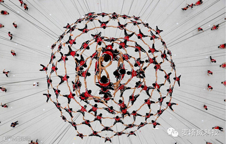 技术含量最高、最具视觉震撼力的项目是,来自河南少林塔沟武术学校的“武生”呈现的高空威亚节目《筑梦》。520名学员通过地面、空中的完美配合,上下翻飞,组成各种不同的立体造型。