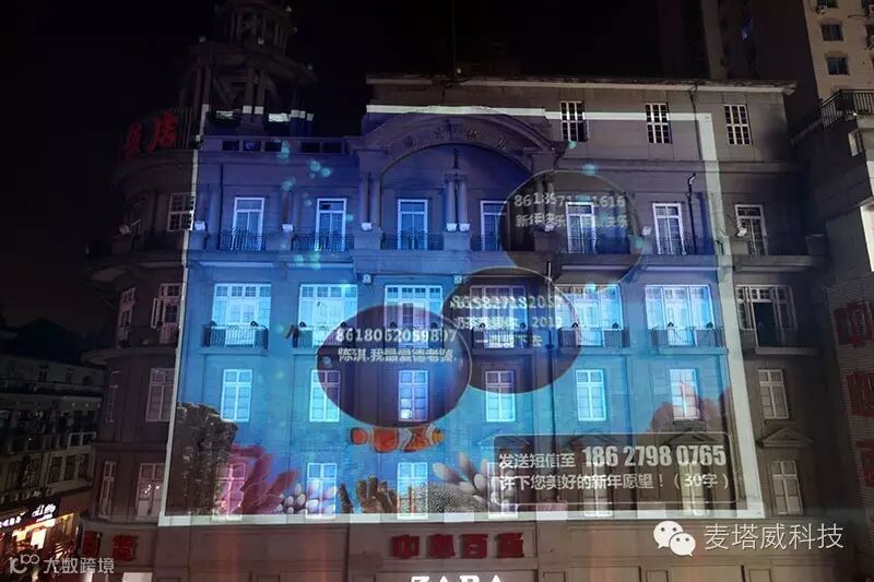 中心百货裸眼3D光影秀,借助多通道投影联动、多边形曲面校正技术和一些特效技术的应用,匹配有着100年历史的建筑外立面本身的形态特征,产生动画和裸眼3D的新奇效果。表现手法灵活、新颖时尚。