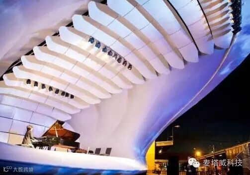 该舞台具有非常杰出的声学效果。舞台以铝制框架为支撑结构,外部覆以可充气的薄膜,形态看上去像一个贝壳,为了进一步提高声学性能,在内部镶入了木板。设计还特别加强了舞台上在表演者之间说话的声学效果,台下的观众不但能听到优美的音乐声效,同时也能听清舞台上的台词对白。这些独特的舞台很容易搭建,也很容易拆卸并用在另一个地方。