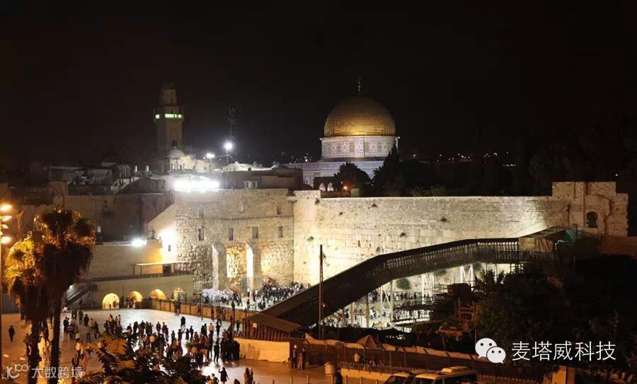 灯光下的西墙和金顶清真寺