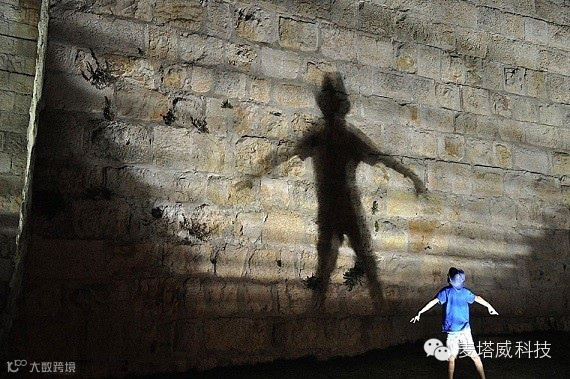 一个男孩在老城的古旧城墙,和自己的投影做游戏