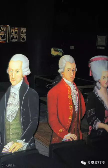 在莫扎特和他姐姐爸爸的画像前面,摆放着几张供人坐着欣赏的椅子,椅子的靠背做成了人物背影的形状,有意思。