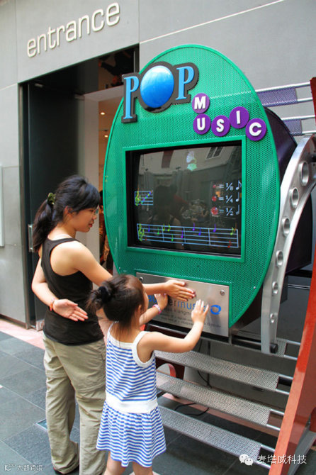 在一楼展厅的入口处有一台音乐POP机,孩子们最喜欢这个东西,这台机器上有个摄像头,孩子一边触摸屏幕上的音符,发出美妙的音乐同时,还可以在屏幕上看到自己的笑脸。于是,孩子们就可以在游戏中。
