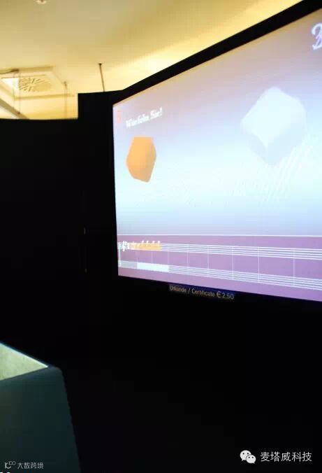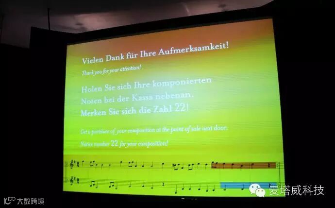 这是个德英双语的“掷骰子编圆舞曲”大型游戏机了(WaltzDiceGame)。大屏幕前放着俩桌子,上有一红一蓝俩骰子,根据对玩家扔出来的不同频率、力度、骰子翻滚和弹跳情况等的感应,机器会将其“翻译”成不同的旋律。两个骰子一个对应大提琴cello一个对应小提琴violin,轮流各扔四次,一段八小节(一般是两个乐句)的华尔兹(结尾还自动带了个反复符号)就写好了,这个时候机器就会给你自动演奏一遍。