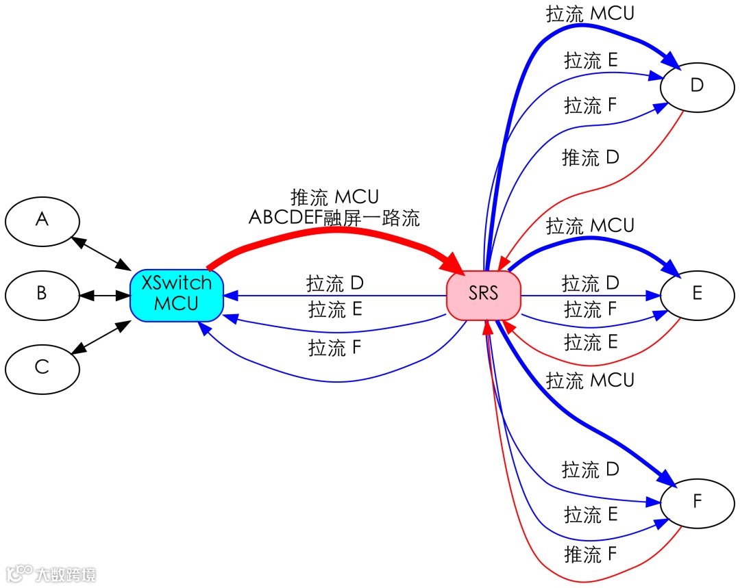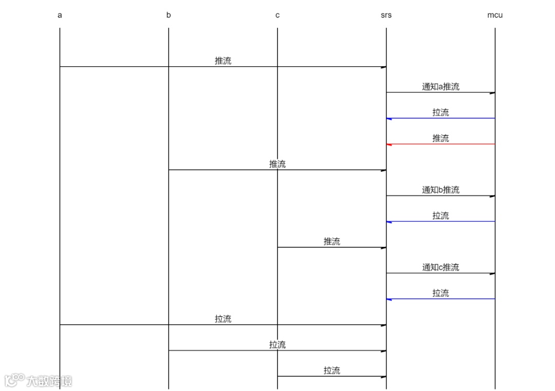 其中,红色代表推流,蓝色代表拉流,黑色是双向流。