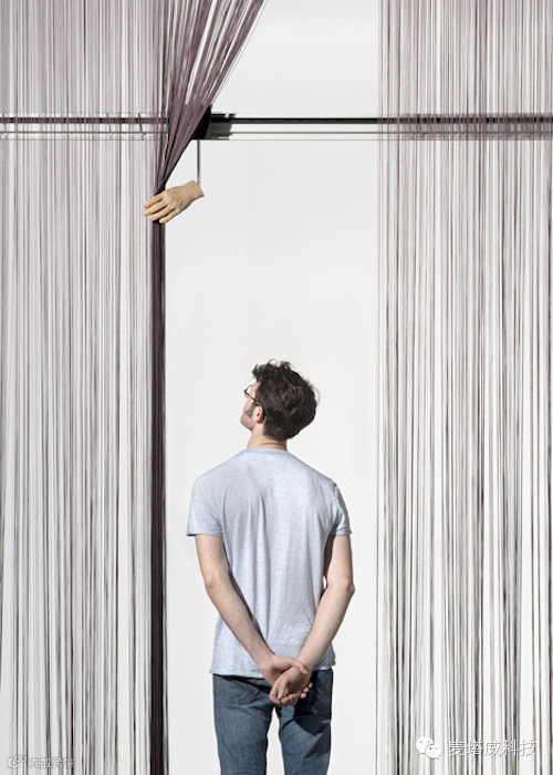 Anne-Sophie Bazard,Tristan Caré 和 Léonard Golay 设计的 Il Portinaio 是一个窗帘,当人经过窗帘时,窗帘上的机械臂会跟着走,当人转身时,机械臂会拉开一段窗帘,让人浏览窗外的风景。