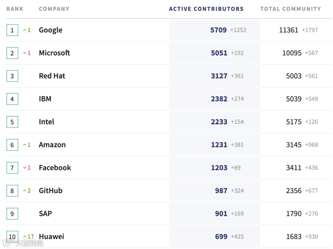 上表显示了2020年 OSCI (Open Source Contributor Index)对为开源做出贡献的组织排名,一个重要观察结果是企业参与度总体上有所提高——这表明企业开放源码活动的增长长期呈上升趋势。