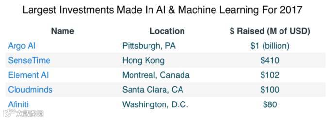 到2017年为止,近40%的资金流向了两家公司。今年2月,总部位于匹斯堡的Argo AI人工智能技术公司从福特公司获得了10亿美元的投资。就在本周,位于中国的商汤科技(SenseTime)筹集了4.1亿美元,用于开发基于人工智能深度学习技术的应用,用于面部识别和图像处理等。