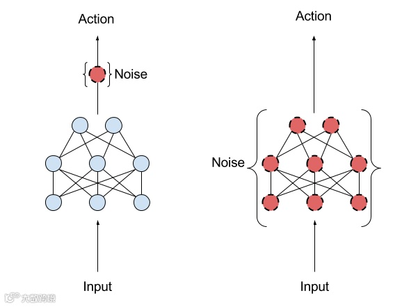 参数噪声方法是将自适应噪声加在神经网络策略的参数中,而不是加在行为空间。传统的增强学习(RL)利用行为空间噪声来改变智能体每一刻执行的动作的可能性。参数空间噪声使智能体的参数直接增加了随机性,改变了智能体做出的决策的类型,使它们总是能完全依赖于对当前环境的感知。这种技术介于进化策略(可以控制智能体的参数,但是当它在每一步中探索环境时,不会再次影响它的行为)和类似TRPO、DQN、DDPG这样的深度增强学习方法之间 (不能控制参数,但可以在策略的行为空间上增加噪声)。