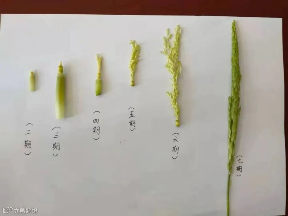 五期颖壳分: 六期谷半长: 七期穗变绿: 八期穗将伸: