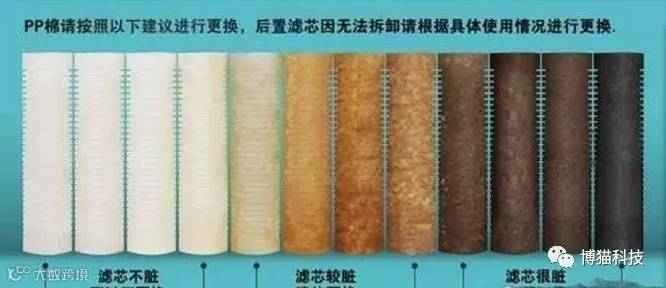 (1)、PP棉滤芯:主要用来去除水中的泥沙、铁锈等大颗粒杂质,前置活性炭滤芯主要用来吸附水中的异色、异味、余氯等,一般使用的周期为3-6个月。