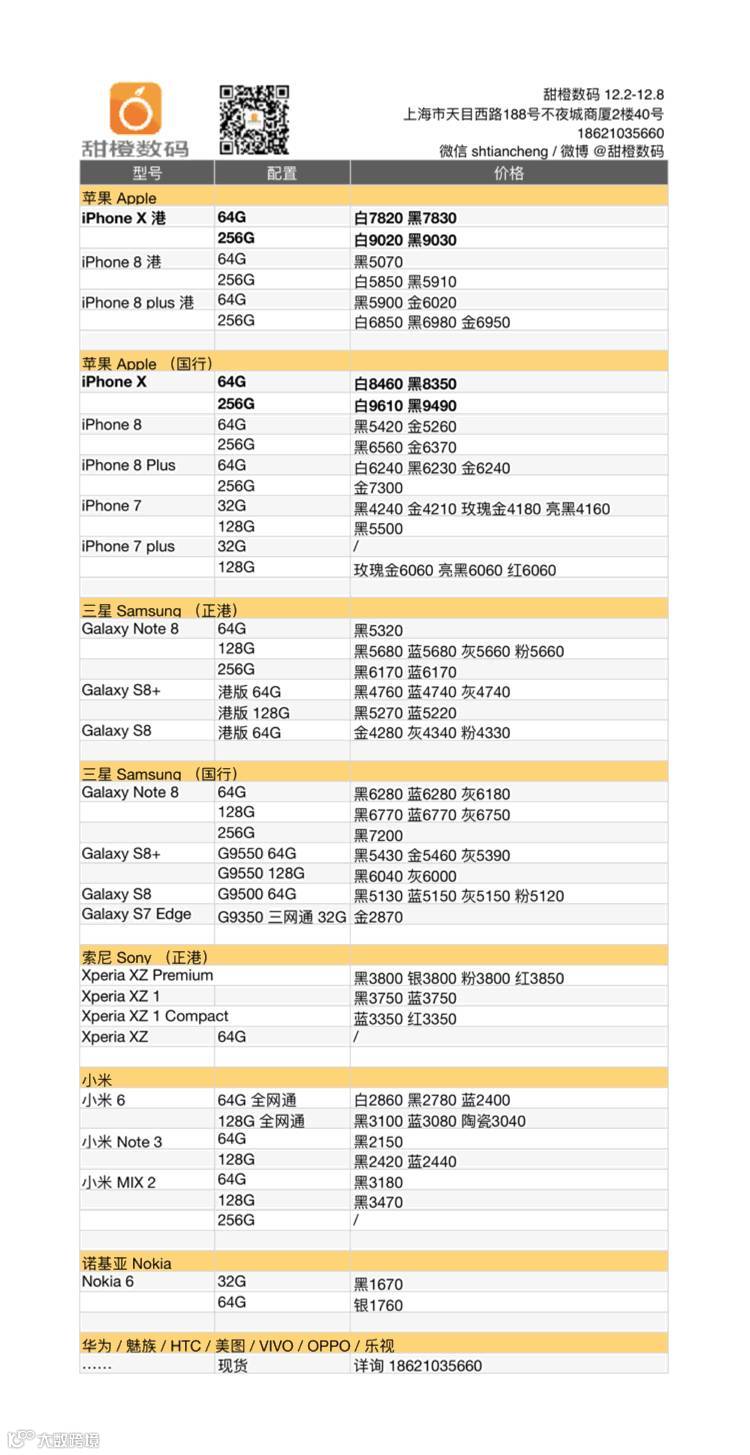 本周 iPhone X 港版机型已有现货,相较国行机型有大约 500 元价格优势;iPhone 8 及 plus 价格稳定;三星 Galaxy Note 8 国行版港版机型都有 50 元走低;小米 6 价格居高不下,但 MIX 2 价格出现了松动;索尼各款机型价格稳定。