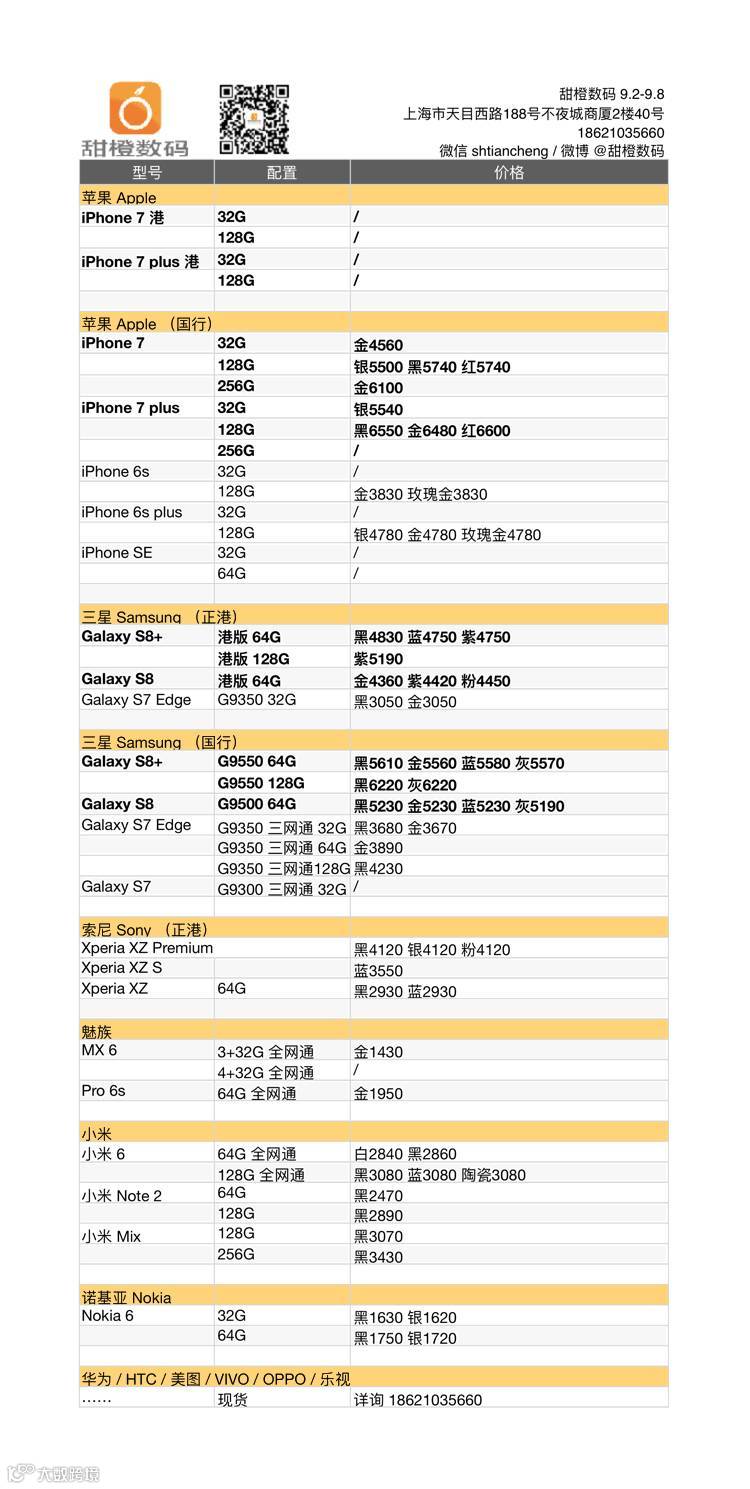 iPhone 新机发布已定,现有机型供货减少且价格波动较大,可随时拨打 18621035660;三星 Galaxy S8/S8+ 价格稳定,小降 10 元,S7 大降超 100;S8 和 XZ P 新粉色款到货;魅族、小米等机型稳定。