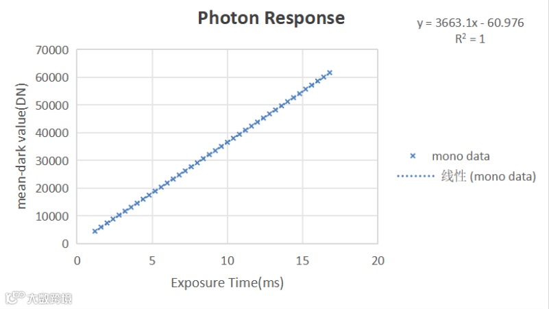 众所周知,暗电流随温度升高而增加;随曝光时间延长,暗电流对应的灰度值线性上升,带来两方面影响:一是导致暗场下平均灰度值与曝光时间的关系发生变化,二是导致暗场下暗噪声与曝光时间的关系发生变化。