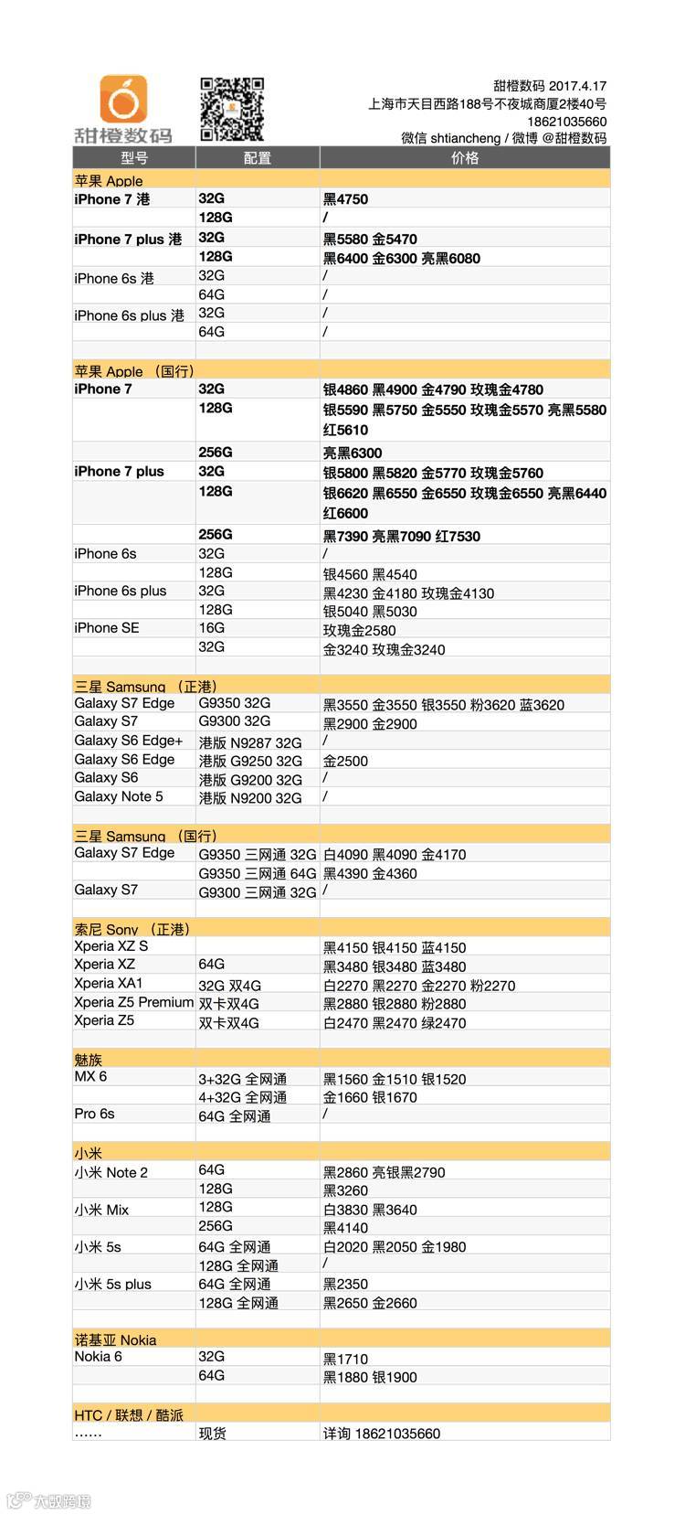 iPhone 7 及 plus 港版机型稳定,国行版的小容量款价格小幅反弹 10 元;三星 Galaxy S7 Edge 64G 版再次小幅走低,32G 版目前稳定;小米多款机型有上下 10 元的小波动。