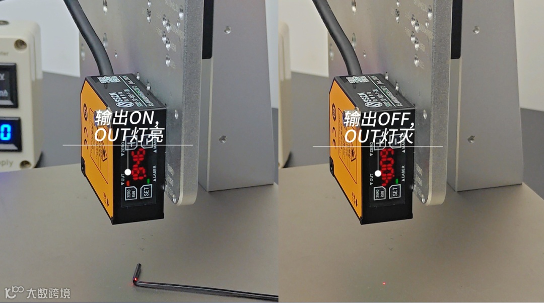 完成设置后,系统即进入一点示教模式。当传感器的测量值小于你设定的【Far】阈值时,它将输出【ON】信号,面板上的【OUT】指示灯会点亮;当测量值大于设定值时,则输出【OFF】信号,【OUT】灯熄灭。